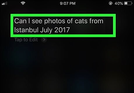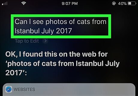 Search things and objects in your photos. If you've taken photos of a certain object, such as cats, trees, or the sea, you can ask Siri to show you all the photos where you can see this object. For example, you can say "Please pull up photos of cats" or "Show me photos of trees."