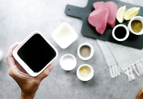 Make a soy-based marinade. This will help to flavour the tuna steak and keep it moist while cooking. For example, combine 1 cup (236 ml) of soy sauce, ½ cup (118 ml) of lemon juice, and 2 cloves of minced garlic in a medium bowl. Then add salt and pepper to taste. Alternatively, you could place the ingredients in a resealable plastic bag.