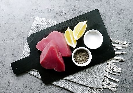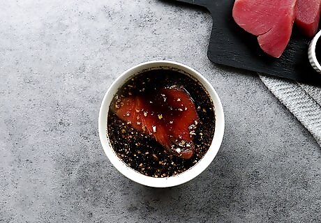 Add tuna to the marinade. Once you have completed the marinade, add the tuna to the bowl or plastic bag. Dip the tuna entirely into the liquid marinade, so that all sides of the steak are coated.