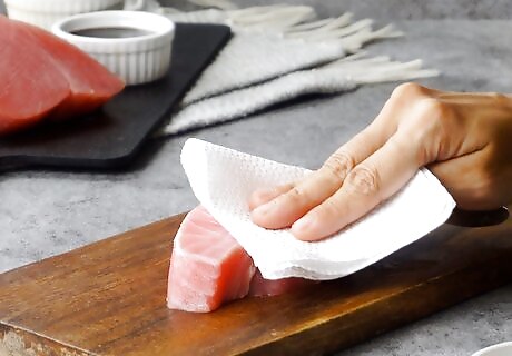 Pat the tuna steak dry with paper towel. This will help the spices stick to the tuna. Alternatively, if you are grilling the tuna steaks, then you may want to lightly brush them with oil before rubbing with spices. This will prevent the tuna from sticking to the grill.