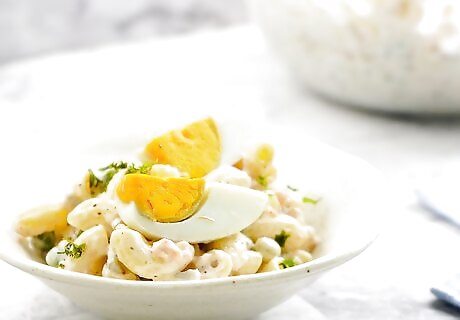 Try a tuna casserole. Tuna casserole is a tasty and simple way to incorporate tuna into your diet. To make tuna casserole, you will need to combine canned tuna with noodles, cream of mushroom soup, peas, onions, and any other vegetables. Then bake the dish in the oven and finally sprinkle with cheese before serving.