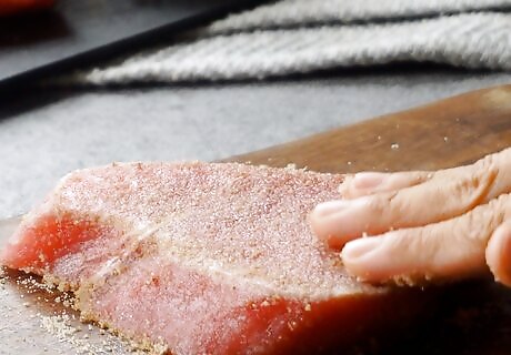 Rub the seasoning onto the tuna. You can do this by sprinkling the spice mix onto a cutting board and then pressing all sides of the tuna into the spices. Alternatively, you can sprinkle the spice mix directly onto each side of the tuna and then massage it into the meat using your hands. The tuna is now seasoned and ready to be cooked. Try searing your tuna after seasoning it. Use a torch or a flat iron grill for better results.