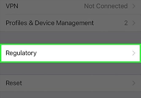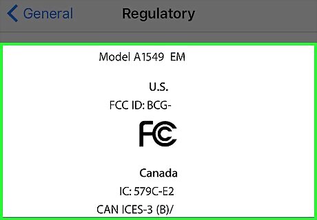 Review your iPhone's regulatory information. Information such as your model number, country, FCC ID, and so on is stored here. If you type your model number (e.g., "Model A1660") into a search engine, you'll find your phone's exact model. The "EMC" number to the right of your model number (e.g., "EMC E3085A") is your phone's FCC ID, which determines the type of device (in this case, a cellular phone with Bluetooth). You'll also see sections of information with headings for U.S., Canada, Europe, and China in this menu. The information listed below these headings details technology compliance information for the pertinent regions (for example, the "CE0682" under the "Europe" section means your iPhone is deemed a "safe" device by the European Union).