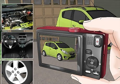 Take color photographs of the car. Vivid color photographs can make your car worth every penny that you advertise it for. Park your car in front of a neutral background, so that the viewer will focus on the car. You can park in front of a brick wall or a garage, for example. Then take photographs from a variety of angles. Make sure to photograph the following: exterior interior trunk engine wheels tires