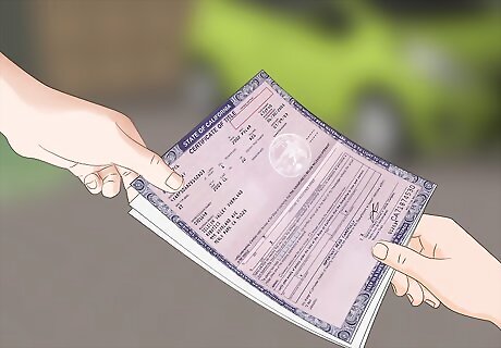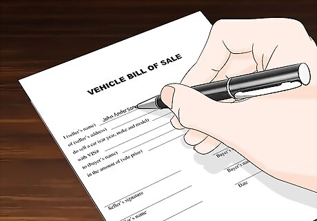 Sign over the title. In most states, you need to transfer the car by filling out your certificate of title. Check with your state’s motor vehicles office. Generally, you need to complete and sign the back side of the Certificate of Title and hand it over to the buyer along with a bill of sale. You should keep copies of the title and bill of sale for your records.