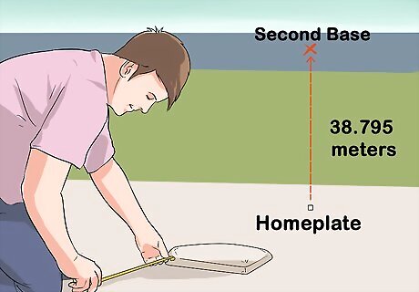 Determine the location of second base. Begin your measurement from the back corner of home plate. From there, extend your tape measure straight forward from home plate into the infield. Measure a distance of a 127 feet and 3 3/8 inches (38.795 meters). Mark this measurement with a stake in the ground. If you’re only setting up a diamond for a friendly neighborhood game, go ahead and place your second base down now, with the mark from your stake as its center.