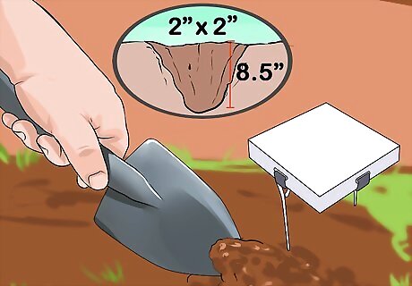 Anchor your bases. For each base, dig a 2’ x 2’ hole, 8.5” deep, where the base will be. Level the bottom and then set your anchor inside. Before burying the anchor, attach the base to the anchor's post. Double-check the anchor's placement by remeasuring the base’s distance from the back tip of home plate. Reposition the anchor if necessary. Then fill the hole back in with soil. Compact the soil at the bottom of your hole to make sure your anchor doesn’t settle any farther down over time. Make sure the bottom is level so that the base will be, too. Also make sure that the soil you shovel back into the hole is compact by adding only small amounts at a time and packing that in before shoveling in more. Remember that for second base, you’re measuring from the back tip of home plate to the center of second base. For first and third bases, you’re measuring from the back tip of home plate to the foul-side corner of each base. The top of your anchor post should be roughly a half-inch below the top of your hole. Lay a 2x4 over the hole and measure the distance between its bottom and the top of the post to double-check the distance before burying the anchor.