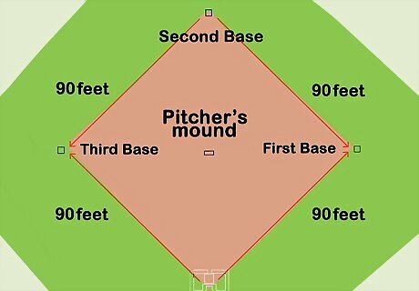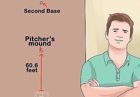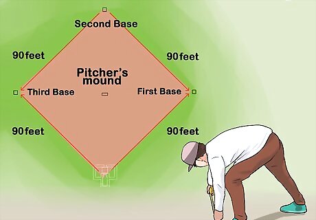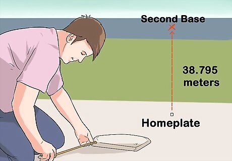 Determine the location of second base. Begin your measurement from the back corner of home plate. From there, extend your tape measure straight forward from home plate into the infield. Measure a distance of a 84 feet and 10 1/4 inches. Mark this measurement with a stake in the ground. If you’re only setting up a diamond for a friendly neighborhood game, go ahead and place your second base down now, with the mark from your stake as its center.