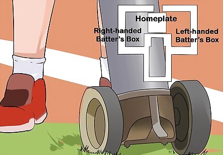Set up home plate. Determine where “home” will be. Position your plate. Face the flat portion of the plate toward the field so that the back corner points away from it. For official play, plan to remove the grass surrounding home plate. Once you’ve positioned your plate, measure a 13-foot circle encompassing it, with the back corner of the plate as its center. Use spray-paint to trace the circle of turf to be removed later.
