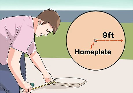 Set up home plate. Determine where “home” will be. Position your plate. Face the flat portion of the plate toward the field so that the back corner points away from it. For official play, plan to remove the grass surrounding home plate. Once you’ve positioned your plate, measure a 9-foot circle encompassing it, with the back corner of the plate as its center. Use spray-paint to trace the circle of turf to be removed later.
