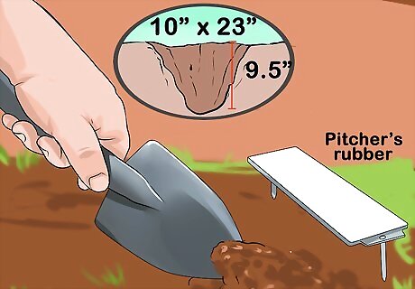 Anchor your pitcher’s rubber. Dig a 10” x 23” hole, 9.5” deep, where the rubber will be, with the longer side parallel to the front of home plate. Level the bottom, place the anchor inside, and stake it into position. Press soil along the base of each tube in the anchor to prevent concrete from leaking inside. Then fill the area surrounding the anchor with concrete without covering the anchor itself. Once the concrete has dried, withdraw the stakes and plug the anchor’s tubes. Refill the hole with soil. Then unplug the tubes and attach the rubber. When you first place the anchor into the hole, attach the rubber. Double-check the anchor’s placement by measuring the distance between each of the rubber’s front corners with those of home plate to make sure they’re equidistant. Then gently remove the rubber without moving the anchor out of position. Compact the soil at the bottom of your hole to make sure your anchor doesn’t settle any farther down over time. Make sure the bottom is level so that the rubber will be, too. Also make sure that the soil you shovel back into the hole is compact by adding only small amounts at a time and packing that in before shoveling in more. The top of each tube should be 1.5” below the top of the hole. Lay a 2x4 over the hole and measure the distance between its bottom and the tubes’ tops to double-check the distance before pouring concrete.