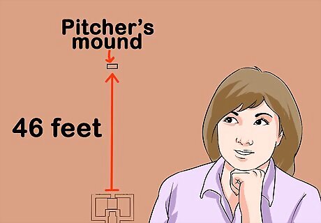 Find your pitcher’s mound. After you’ve marked second base, keep your tape measure fully extended. Slowly retract your tape measure until you’re 46 feet away from home plate. Stake the ground here to mark where the front of your pitcher’s rubber will be. For a temporary field, go ahead and place your pitcher’s rubber now, with the front of the rubber centered at the mark you’ve just made in the ground. Position the rubber so that it’s parallel to the front of home plate. For a permanent field to be used for official play, plan to create a pitcher’s mound. Once you’ve marked where the front of the rubber will be, continue to slowly retract the tape measure toward home plate by another 10 inches. Stake the ground here to mark the center of your mound. With this mark as your center, measure an 10-foot circle surrounding it. Use spray-paint to trace the area for later turf-removal and/or added soil to elevate the mound.
