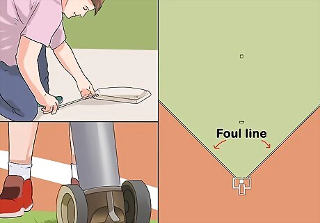 Create two foul lines. For each, begin your measurement from the back corner of home plate. From there, measure a distance of 325 feet along the outside of the square created by the baselines. At that distance, plant a pole marker. Then stretch a lining cord between the back corner of home plate and the pole marker. Chalk directly over the lining cord to create your foul line. Also an install a protective fence that extends 400 feet from home plate behind each foul line to shield spectators.