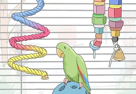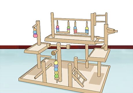 Provide a parrot gym. The more intricate and complex your gym, the more your parrot will like it. The key is to create a gym with many different parts. Experiment and have fun when you pick or create a gym for your bird. While you can purchase a complete gym, you can also add different elements, like: Ropes Perches Baby toys Ladders