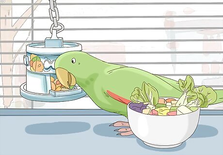 Place two to three food dishes in the habitat. Because your eclectus likes to forage, you should place food dishes in different location in your habitat. This is especially true if you have a large cage with several birds. In addition, the food dishes should be weighted or attached to the cage so they can’t be dumped or turned over. Give your eclectus 2 to 4 ounces of fresh fruit and vegetables per day. The amount of vegetables depends on the age and size of your bird. Provide your eclectus with an ounce of pellet bird food every day. Do not give your eclectus seeds. Puzzle feeders can help your bird try natural rooting and exploring behavior whilst eating.