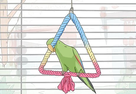Place a cotton rope swing in the cage. The rope swing should be around 4 to 5 feet (1.21 to 1.52 m) in length. Hang it in the cage so your eclectus can easily access it. Your bird may perch on it and chew on it. Because of this, you’ll have to replace it fairly often. Ultimately, though, your eclectus will have a lot of fun using the swing. Avoid soft cotton, as they may be able to shred it too easily. While it is okay if they shred it, you’ll want the swing to last as long as possible.