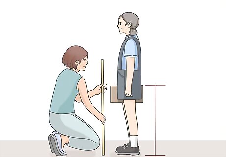 Place a hardcover book between their legs at crotch level. Ask them to put the book between their legs so that the book has its spine facing up and the pages facing down. Help your child push the book up until it reaches their crotch, and then ask them to squeeze it between their legs. If your child is bending down to hold the book, you won’t be able to get an accurate measurement.Alternative method: If you would prefer not to use a book, or if your child is uncomfortable with it, you can simply measure from the floor to the point just below where your child’s leg meets their crotch, though this may be less accurate.