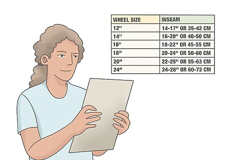 Consult a tire size chart. There are many sizing charts available for you to look at and find the right fit for your child’s inseam measurement, height, and age. The tire diameter is the measurement most companies use to size their bikes, but it can vary a great deal for children. You can find a tire size chart at https://www.twowheelingtots.com/ or https://rascalrides.com/.