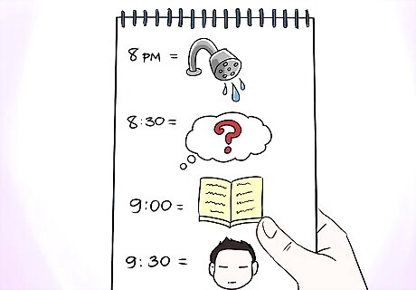 Create a bedtime schedule. A ritual will help tell your body that it’s time to go to bed. It will also help clear your head so that your fall asleep faster. Create a schedule for the two hours before bedtime. In this schedule, set-aside 30-minute blocks for relaxing activities. For instance, if you went to bed at 10 pm, make that the time when you turn off any electronic or blue screen devices is at 8 pm. At 8 pm, take a warm bath. At 8:30, take time to reflect on the day and any pressing thoughts. At 9:00, do a relaxing activity such as reading a book or stretching. During the last thirty minutes, write down anything that is still troubling your thoughts. Write out possible solutions or outcomes to this problem instead of reiterating the problem.