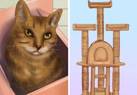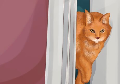 Set up places for your cat to hide. Your cat may be anxious and afraid of its surroundings. To help it feel more confident and secure, make sure the cat has places to which it can retreat and observe the world around it. You can assist by giving your cat places to hide. These don’t need to be anything fancy, and require little work on your part. For example: Set a cardboard box on its side so the cat can crawl in. Pull a sofa or dresser out from the wall by about 6 inches so your cat can crawl behind it. Purchase and set up a “cat tree” that the cat can perch on top of.