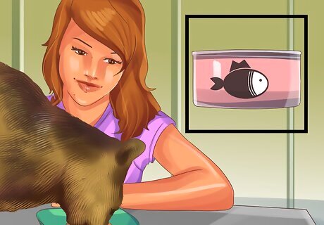 Sit near the cat when you feed it. Although the cat may have constant access to kibble, you can feed it a special treat, like wet canned food or tuna fish. A couple of times during the day, place a dish of wet food or tuna on the floor near your cat. Even if the cat is hiding, it will likely emerge to eat before long. Sit by the food while the cat is eating; this will help the animal become used to your presence. Socializing your fearful cat by feeding it wet food will help the cat form positive associations between you and the food. This will help to decrease its fear. Make sure that the cat always has plenty of water. Although there may be points where you take away the cat’s food (e.g. once it’s finished eating), you should never take away water.