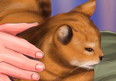 Pet the cat while it’s eating. If your cat has been hesitant to allow you to touch it, or seems skittish around you, you can initiate physical contact while it’s eating. The cat will be happy and relaxed while eating, and petting it then will let the cat form positive associations between your touch and the food. Slowly reach towards your cat and begin to lightly stroke its fur. Begin by petting the cat on its back, and use a light, slow touch. When you reach out to pet your shy cat, do not reach directly toward the cat’s face. This will startle the animal, and it may be perceived as a sign of aggression. Instead, reach from behind the cat.
