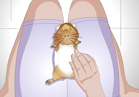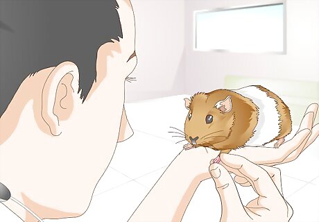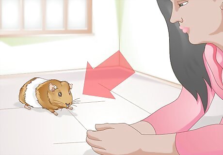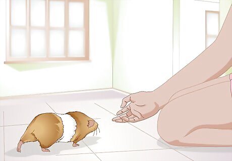 Coax your guinea pig to walk. Because of the painful foot sores, your guinea pig may not want to walk around in its cage. Place some tasty treats in your hand. Lower your hand into its cage and see if it comes to you. If your guinea pig stays where it is, its feet may hurt too much to put pressure on them. If it doesn’t come to you after the first try, do not try again.