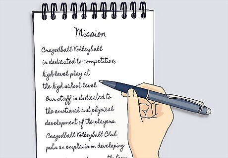Write down the club's mission statement. A mission statement is a list of goals and objectives that you set for your club. This is the initial set of guidelines that will help members, staff, and players make decisions. The mission statement will include whether the club is recreational or aims to be more competitive, and what the ultimate goals of the club are. An example of a mission statement would be "Crazedball Volleyball is dedicated to competitive, high-level play at the high school level. Our staff is dedicated to the emotional and physical development of the players. Crazedball Volleyball Club puts an emphasis on developing each and every player on the team."