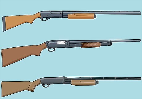 Buy a 12-gauge shotgun. 12-gauge shotguns are the standard for duck hunting. You’ll have to decide whether you want to purchase a semi-automatic or a pump-action model. Popular duck hunting guns include the Remington 870, Winchester Model 12, and Browning BPS. Pump action shotguns require you to cock back the gun before every shot. 20-gauge shotguns are typically used by young hunters while 10-gauge shotguns are popular for goose hunting.