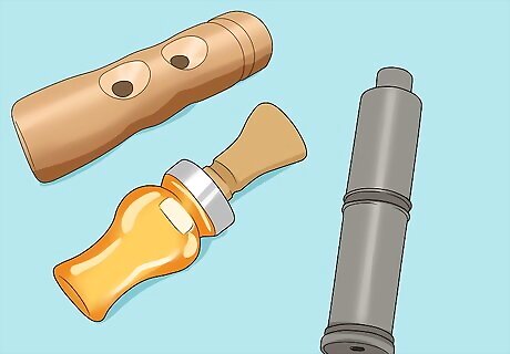 Buy a duck call for the species you plan to hunt. You can purchase a duck call at a hunting or sporting goods store. Using certain calls will attract ducks to your location, making it easier for them to shoot. Duck call whistles are typically the easiest for first-time hunters to use because you can just blow in them and don’t have to make a specific noise when using them.