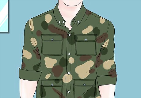 Wear camouflage that blends in with your surroundings. You can purchase a variety of different camouflage online, at hunting stores, or in most sporting goods stores. Purchase a camo shirt, pants, gloves, hat, and jacket. This will help you blend in with your surroundings and can prevent you from scaring away ducks. If you are hunting in an area with wheat stalks or dead grass, a lighter camo is perfect. If you are hunting in an area with a lot of foliage, plants, and bushes, a greener camo is ideal. Dark black or brown camo is best in wooded areas.