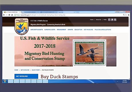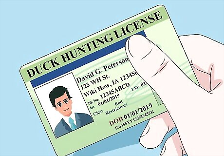 Purchase a Federal Duck Stamp if you live in the U.S. If you’re over 16 years of age and plan on hunting ducks in the United States, it’s mandatory that you purchase a Federal Duck Stamp. You can buy one at hunting stores, sporting goods stores, or online by visiting https://www.fws.gov/birds/get-involved/duck-stamp/e-stamp.php. Stick your stamp onto your hunting license. A Federal Duck Stamp also gives you free entry into national wildlife refuges. Purchasing a Federal Duck Stamp supports bird habitat conservation.