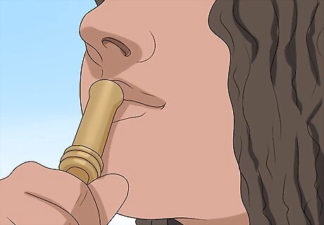 Use your duck call if you have one. A duck call isn’t always necessary for a hunt, especially if you are hunting in a duck-heavy site. However, if you’re having trouble attracting ducks, you can use several duck calls. There are a variety of different calls and include the basic quack, greeting call, feed call, pleading call, and whistles. The greeting call is 5 or 6 notes and sounds like “Kanc, Kanc, Kanc, Kanc, Kanc.” The pleading call is used for birds that are flying high above you and sounds like “Kaaanc, Kanc, Kanc, Kanc,” with the first note being held for a longer time.