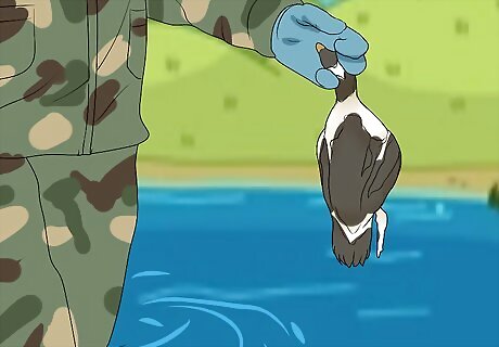 Retrieve any ducks that you’ve shot. If you don’t have a dog that’s trained to retrieve ducks, then you’ll have to retrieve them yourself after you’ve shot them. Make sure that everyone is done shooting, then go to the location where you downed the duck and store it in a sack until you dress it. Always wear rubber gloves when handling ducks because they could be carrying diseases. If the downed duck fell into the water, wear high boots and waders to retrieve it from the water.