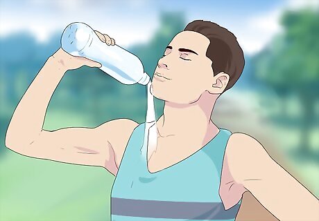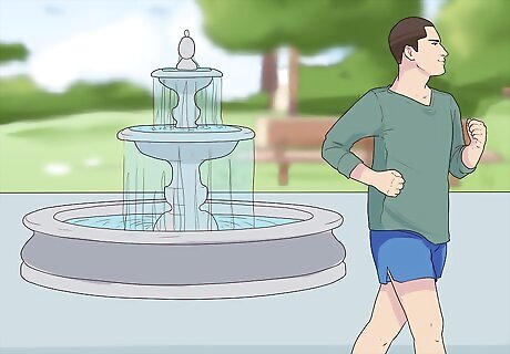 Walk from fountain to fountain. If you’re at a public park or on a walking course, water fountains might be located at regular intervals along the path. If this is the case, stop and sip from them as you walk. This will help you preserve the water in your bottle, which you might use quickly depending on the temperature outside and the length of your hot weather walk.
