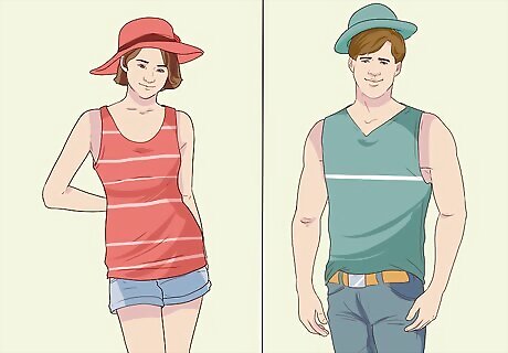 Dress properly. When taking a hot weather walk, wear loose-fitting, light-colored clothing. Avoid dark colors, as they absorb more heat. Wear a wide-brimmed hat if possible. When looking for hats, look for lightweight, mesh fabric around the scalp with a brim that covers the forehead and back of neck. The hat should also be made from breathable material that allows perspiration to quickly escape. Select clothes made from synthetic moisture-wicking fabrics instead of cotton, which retains sweat and can cause discomfort.