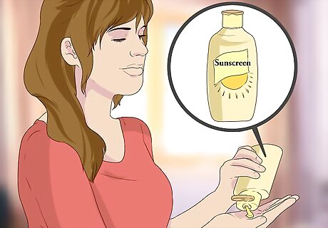 Use sunscreen. Ensure you wear sunscreen with strength of at least 30 SPF. Look for a sunscreen that has both UVA and UVB protection. Cover your face, nose, neck, arms, and shoulders. These are the areas most exposed to the sun and the areas that tend to burn most easily. If your chest or back are exposed, cover them with an even coat of sunscreen, too. Avoid scented sunscreens, as they attract bugs. Additionally, wear sunglasses. Protecting your eyes is extremely important no matter the weather. Choose sunglasses that offer 99% or greater UV protection.