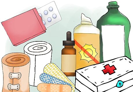Create a travel health kit. Make yourself a small kit of items you may need in the event of a health issue. Putting together anti-diarrheal medication, bandages, or water sterilization tablets can help minimize your risk of contracting an illness. Your kit should include: Prescription medications, including an extra supply in case you lose or run out and can’t get to a pharmacy or doctor. A pain reliever and fever reducer such as acetaminophen or ibuprofen. Allergy medication An assortment of band-aids. Moleskin or blister care. Gauze. Electrolyte solution or powder. Antibiotic ointment. Sunscreen. Anti-malarials A broad spectrum anti-biotic. Water purification tablets. Anti-diarrhea medication. A sewing kit to repair holes in clothing, which can deter insects from biting you.