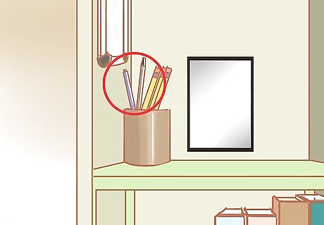 Store extra school supplies higher up. On the top shelf of your locker, or in a magnetic pencil cup, store extra pencils, pens, and erasers. You can add optional supplies like sticky notes, white-out, or extra pencil lead, but try to limit yourself to one container to save space.