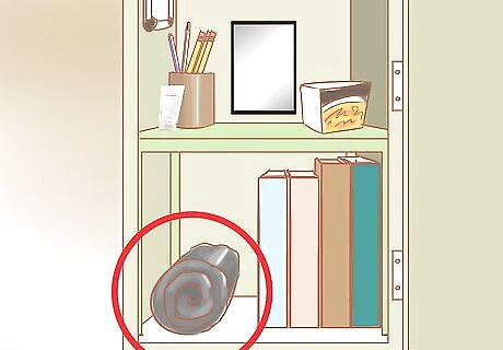 Keep spare clothes in your locker if possible. If you have the space, roll up a spare T-shirt and/or sweatshirt in case you get caught in the rain. You may also need to store your gym clothes here, although some schools provide a second gym locker. Store these at the bottom of your locker, underneath your lowest locker shelf, or hang them up at the back if there are spare pegs. If you have a large locker and are bundled up for winter weather, put down a fluffy towel so you can store wet boots, hats, and mittens at the bottom of your locker without flooding the locker or floor below.