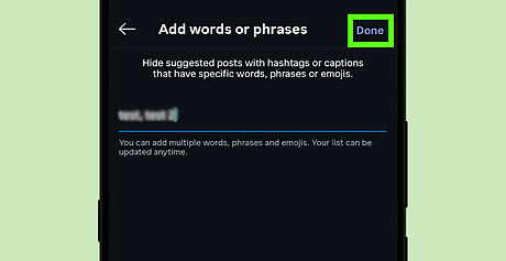 Tap Done. It may take up to 24 hours for the muted words to stop affecting suggested posts. Also, entries must exactly match the hashtags used in suggested posts to hide them. This setting does not affect suggested posts when visiting Instagram via a web browser (instagram.com).