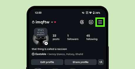 Open Instagram settings. Tap your profile picture at the bottom right of the app. On your profile page, tap the ≡ hamburger button in the top-right corner to open settings.
