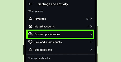Find Content Preferences. Under the “What You See” section, select “Content Preferences,” located near the “Muted Accounts” option.