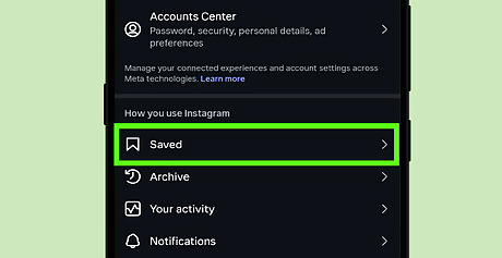 Tap on “Saved.” You can find this under the How You Use Instagram section. On PC, click the “≡ More” button at the bottom-left corner of the screen, then choose “Saved” from the options. You can also access it directly from your profile by tapping the “Saved” icon.