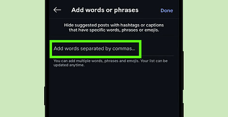 Add words, phrases, or emojis. Enter the items you want to hide from suggested posts. You can add multiple entries at once by separating them with commas (e.g., entry1, entry2). Use Google to find lists of words commonly associated with adult content.