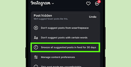 Tap on Snooze all suggested posts for 30 days. If successful, Instagram won’t show you suggested posts for 30 days, unless you’ve already seen all posts from accounts you follow.