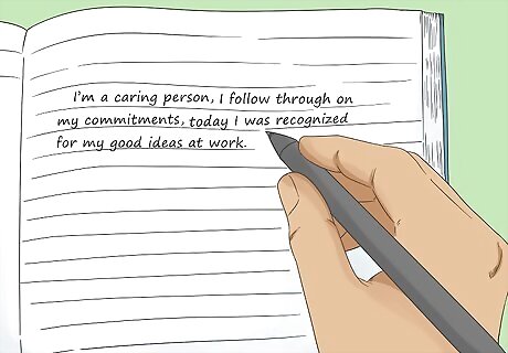 Practice gratitude. Write down something positive about yourself daily. Start your day by noting something you love about yourself in a journal. Then refer back to it throughout the day to remind yourself of what you like. Write down what you are grateful about at the end of the day. Here you’ll want to focus on what you have and what you have accomplished, rather than what you want and past failures. Read this every night and you may find that you have a more positive image of yourself and have feelings of gratitude.