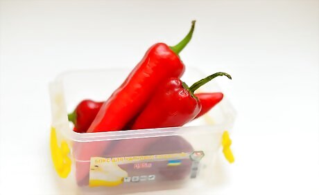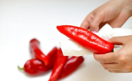 Clean the peppers, but do not wash them. If you are not using the peppers in a recipe immediately, do not wash them with water. Simply brush the dirt off with your hands or a paper towel. If you rinse them before storing them, the excess moisture will promote the growth of bacteria and cause premature spoilage.