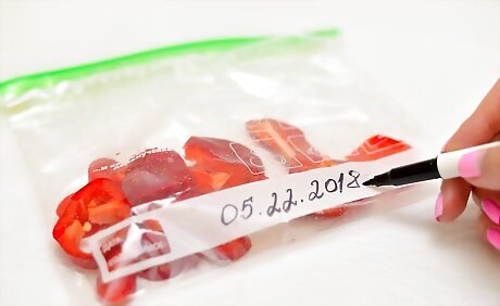 Label your freezer bags and place them in the freezer. Writing the name of the pepper and date you froze it is important to reduce food waste. Anaheim peppers will last between eight and twelve months in the freezer. Place newer bags toward the back of the freezer, and do not crowd the bags so freezing occurs evenly.