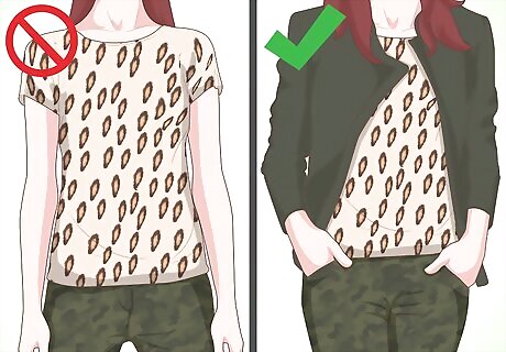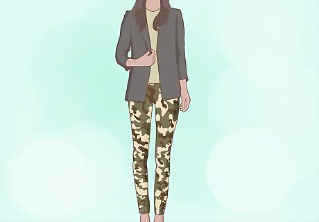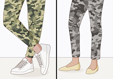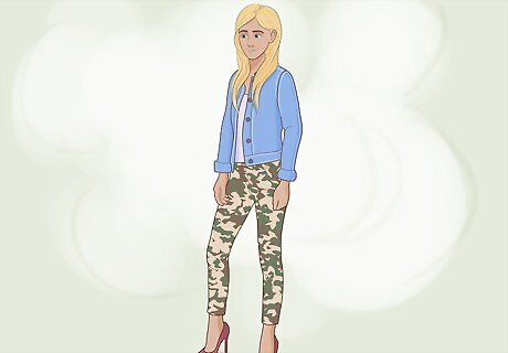 Avoid wearing camo pants with other loud patterned clothing. Camo pants are already a bold pattern to wear, and adding another loud element can overpower your outfit. Animal print in particular clashes with camo because both patterns are fairly similar. If you are up for the challenge, make sure you break up additional patterns with solid pieces. If you wear a patterned top, throw a solid-colored cardigan sweater over top, for example.